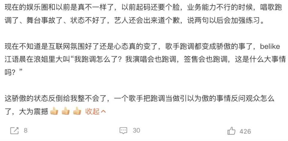 如果说舞台跑调是业务能力问题,那她赛后的回应,就是态度问题,直接把观众的最后一点包容耗光。